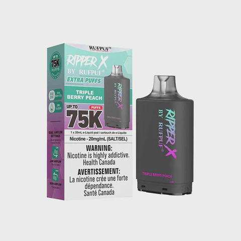 Meet the Ripper X Pod by Rufpuf 75K – pairs seamlessly with the Ripper X Ultra Battery (Sold separately), offering up to 75K puffs, 20mL of Rufpuf salt juice, dual mesh coil, and dual airflow system.